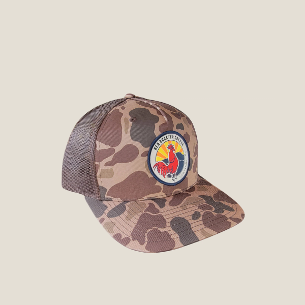 Get ready for fall with our duck camo Five-Panel Trucker Patch Cap. Featuring our rooster sunrise patch and a breathable mesh back to keep you cool.