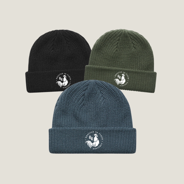 Crafted with a wide, ribbed knit and a fitted, fisherman style, cuffed hem, this beanie is the perfect accessory for any weather. Our Roasted in Floyd, Virginia rooster is embroidered in white on the front fold. These beanies do run a bit short-a large head might not get ear coverage!