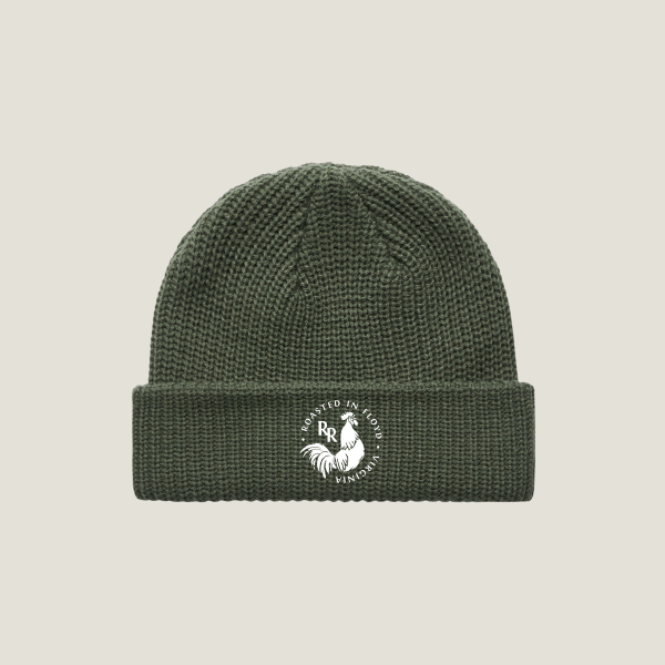 Crafted with a wide, ribbed knit and a fitted, fisherman style, cuffed hem, this beanie is the perfect accessory for fall and winter weather. Our Roasted in Floyd, Virginia rooster is embroidered in white on the front fold.