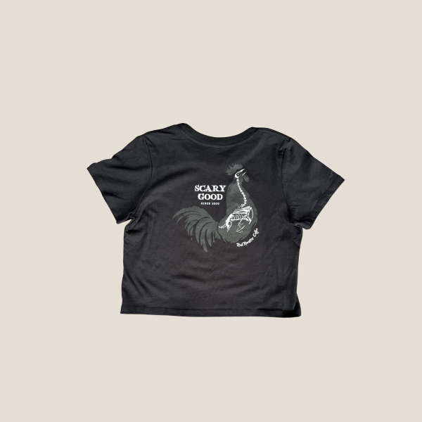 Show your love for all things spooky with our limited edition Scary Good apparel. As requested, you can now rock our beloved Skelerooster on a crop tee! This premium cotton tee shirt is manufactured in the US and will locally screen printed by our friends at Mountain High Tie-Dye & Print. Items will ship out around October 22nd and arrive just in time to get your spooky good gear on for All Hallows Eve.
